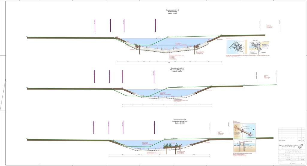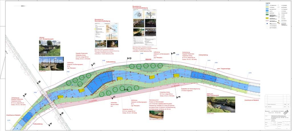 Beseitigung eines Stauwehrs, Brückenabriss und Wiederherstellung der Durchgängigkeit in der Werse (Stationen 33+795 & 34+100) durch eine Sohlgleite mit Einbauten.